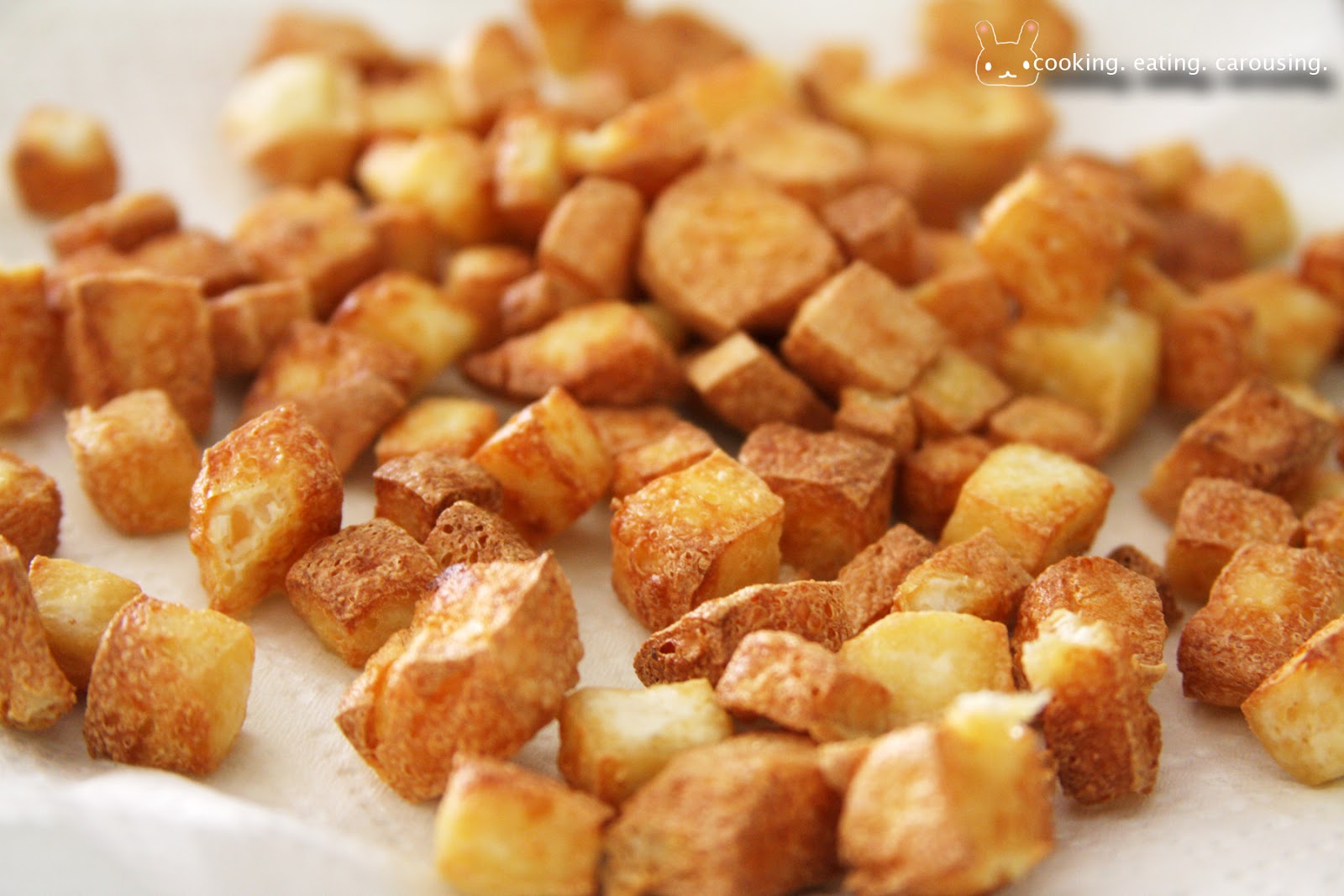 - Cut the tofu into small cubes and deep fry until golden brown and slightly crispy, set aside on a paper towel to drain.